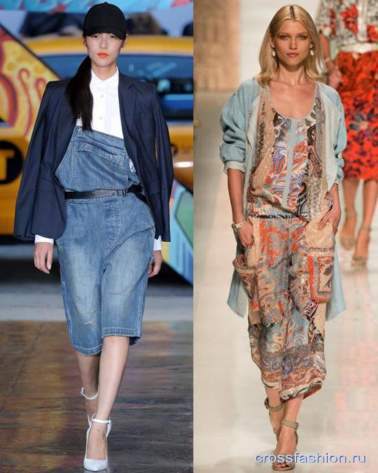 В целом фасоны и отделка комбинезонов поддерживают общие тенденции весенне-летнего сезона 2014 — многослойность, применение кожи и денима, брюки-бананы, металлик, прозрачность, актуальные цвета и т. д. Единственное отличие — вы не встретите в коллекциях ведущих Домов моды нарочито женственные модели, украшенные воланами, оборками или декоративными цветами. В моде комбинезоны отдаленно напоминающие своего исторического предшественника — комбинезон рабочего, состоящий собранных воедино рубашки и брюк или фартука и брюк.