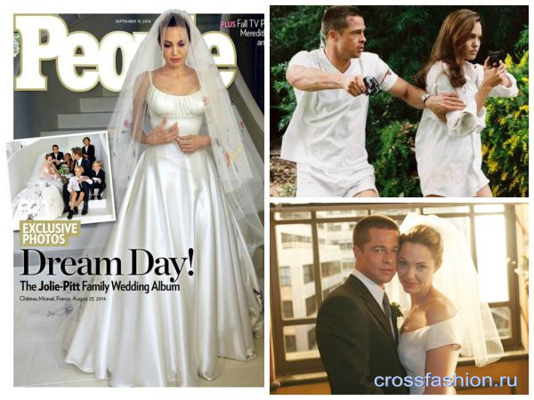 Свадебное платье Анджелина Джоли выбрала простое, без гламурных сверкающих деталей. Создал модель для звезды Луиджи Масси из Atelier Versace. Подол и фату платья